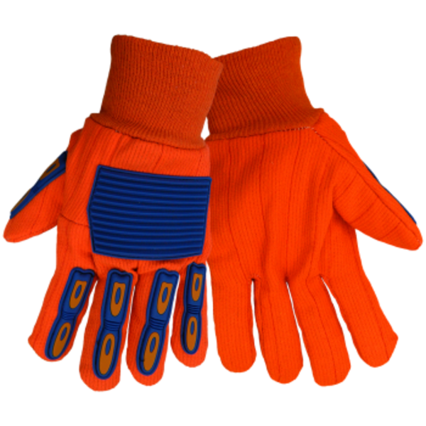 These 18 oz. corded cotton/poly gloves feature added TPU impact protection on the fingers and back of hand and a wing thumb design.These gloves are and excellent choice for applications that require hand visibility for safety.